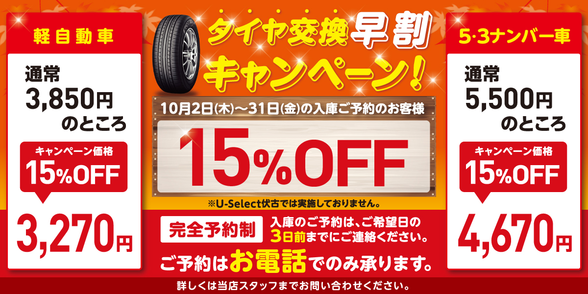 タイヤ交換料金15%OFFキャンペーン!