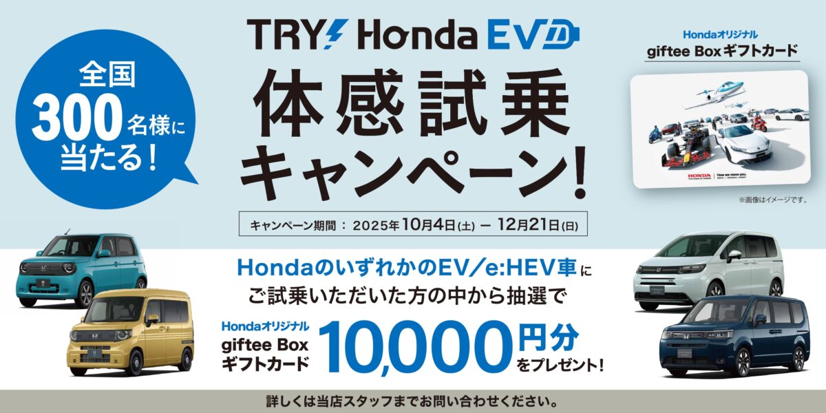 ●キャンペーン期間中に対象のHonda Carsへご来店いただき対象車種にご試乗後、専用フォームからご応募いただいた方の中から抽選で300名様にラインアップの中からお好きな商品と交換できるgiftee Boxのギフトカード1万円分をプレゼントいたします。